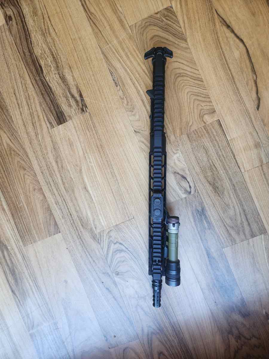 It came with a pinned pws brake on it but I removed it. It's a 14.5" upper.
